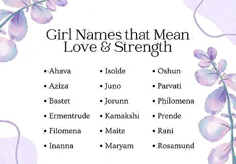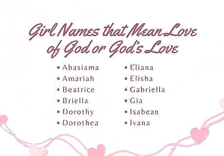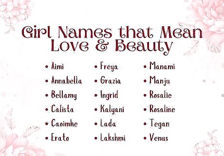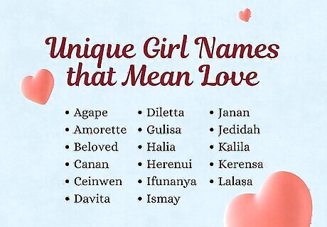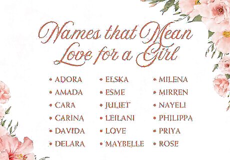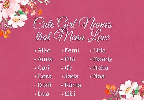 Opt for one of these names if you want something super cute. These names are totally adorable, and they share the same loving meanings as the ones listed above. Here are some choices that are just as cute as your little girl is bound to be: Aiko: “Beloved child,” Japanese origin. Aimee: “Beloved,” Latin origin. Amia: “Beloved” or “friend,” French origin. Cari: “Love” or “beloved,” Gaelic, Latin, and Welsh origins. Cherish: “To love” or “to treasure,” English origin. Cinta: “Love,” Indonesian and Spanish origins. Cora: “Heart” or “maiden,” Greek origin. Darla: “Loved one” or “darling,” English origin. Dodi: “Well-loved,” “gift,” or “gift of God,” Hebrew and Greek origins. Dua: “Love” or “prayer,” Albanian and Arabic origins. Femi: “Love me,” Jamaican and Nigerian origins. Fila: “Loving,” Greek origin. Ife: “Love,” Jamaican and Nigerian origins. Jada: “Loved” and “wise,” Hebrew origin. Kama: “Desire” or “longing,” Sanskrit origin. Libi: “My heart,” Hebrew origin. Lida: “Loved by the people,” Russian and Slavic origins. Mabel: “Lovable,” Latin origin. Mai: “Love,” “affection,” “beloved,” or “wished for child,” Japanese, Hebrew, Latin, Vietnamese, and Arabic origins. Mandy: “She who must be loved,” “lovable,” or “worthy of love,” Latin origin. Mary: “Beloved,” “wished for child,” or “star of the sea,” Latin, Greek, and Hebrew origins. Mia: “Beloved,” “moon,” or “star of the sea,” Australian, Latin, and Scandinavian roots. Mina: “Love,” German origin. Neha: “Loving” or “affectionate,” Indian and Arabic origins. Noa: “Love” or “my love,” Japanese origin. Pippa: “Lover of horses,” Greek origin. Ren: “Love,” “lotus,” honest,” or “clever,” Japanese, German, and British origins. Rosie: “Rose,” symbolically associated with love and romance, Latin origin. Suki: “Beloved,” Japanese origin. Thandi: “Loved one” or “beloved,” Xhosa, Zulu, and Ndebele origin. Vida: “Life,” associated with loving life, Spanish origin.