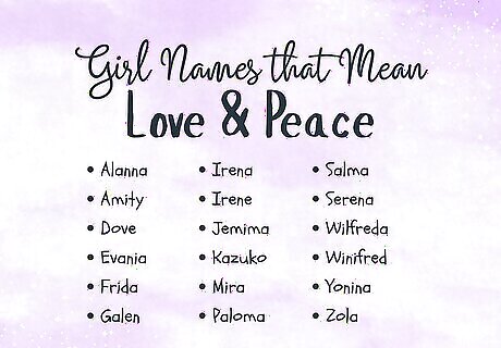 Go for one of these names to combine loving and peaceful vibes. The concepts of peace and love are often talked about together, so why not pick a name that combines both of these energies? These names do just that, and they’re also beautiful and unique. Alanna: “Precious,” “handsome,” and “peaceful,” German, Irish, Hawaiian, and British origins. Amani: “Peace” and “wishes,” Swahili and Arabic origins. Amity: “Friendship” and “harmony,” Latin origins. Dove: A bird symbolizing peace and Aphrodite, Greek goddess of love, English origin. Evania: “Peaceful,” “good news,” or “richly blooming, Greek and Hebrew origins. Frida: “Peace” or “beautiful,” German and Norse origins. Galen: “Calm” or “tranquil,” Greek origin. Irena: “Peace,” “tranquility,” or “harmony,” Greek origin. Irene: “Peace,” Greek origin. Jemima: “Dove,” a bird symbolizing peace and Aphrodite, Greek goddess of love, Hebrew origin. Kazuko: “One” or “harmony,” Japanese origin. Mira: “Admirable” or “peace,” Latin, Sanskrit, and Slavic origins. Paloma: “Dove,” a bird symbolizing peace and Aphrodite, Greek goddess of love, Spanish origin. Salma: “Safe and sound” or “peaceful,” Hebrew and Arabic origins. Salome: “Peace,” “wholeness,” or “safety,” Hebrew origin. Serena: “Serene,” “peaceful,” or “quiet,” Italian and Latin origins. Shiloh: “Tranquil,” “abundance,” “His gift,” Hebrew origin. Wilfreda: “Purposeful peace” or “desiring peace,” British origin. Winifred: “Friend of peace,” “blessed,” or “blessed reconciliation, Welsh and British origins. Yonina: “Dove,” a bird symbolizing peace and Aphrodite, Greek goddess of love, Hebrew and Arabic origin. Zola: “Calm,” “one who is gazed at,” or “beautiful,” African origin. Looking for more peaceful and serene names? Check out this helpful list for more options!