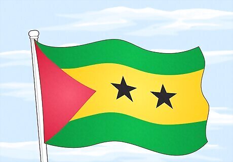São Tomé and Príncipe The flag of São Tomé and Príncipe has a red triangle on the left side of the flag, with horizontal green, yellow, and green stripes making up most of the field. Inside the center yellow stripe are two black stars. This flag has been flown since 1975. Symbolism: Green stands for the country’s lush vegetation; yellow represents the sun and cocoa; the two stars stand for the two main islands of São Tomé and Príncipe.