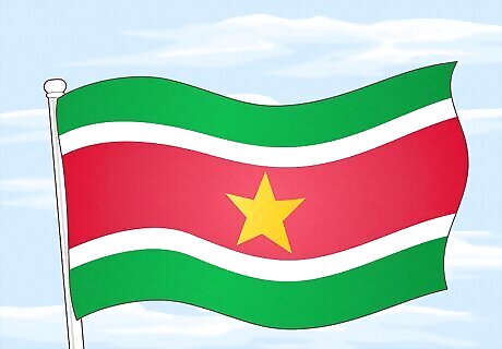Suriname The Suriname flag has horizontal stripes in a green, white, red, white, green pattern. The middle red stripe has a large yellow star. The red stripe is the widest and the white stripes are narrowest. This flag has been flown since the country gained independence in 1975. Symbolism: Green symbolizes Suriname’s jungles and fields; white stands for freedom and justice; red represents a progressive spirit; the yellow star stands for the unity of the people and a bright future.
