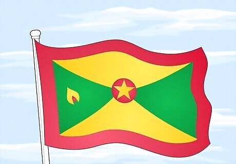 Grenada The Grenada flag has a red border with three yellow stars on top and three on the bottom. The field inside the border is divided diagonally into four triangles: green triangles on the left and right, and yellow triangles on the top and bottom. In the center of the triangles is a red circle with a yellow star. The left green triangle features a yellow and red nutmeg. This flag was adopted in 1974. Symbolism: The red border stands for harmony and unity; the 7 yellow stars represent Grenada’s original administrative regions; yellow represents wisdom and the sun; green represents vegetation; the nutmeg is one of Grenada’s chief exports.