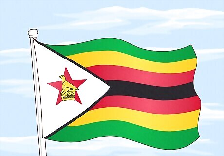 Zimbabwe The flag of Zimbabwe has a white triangle with a black border on the left side, with a green, yellow, red, black, red, yellow, and green striped pattern making up the remainder of the flag. Inside the white triangle is a red star and the Zimbabwe bird in yellow. This flag has been used since 1980. Symbolism: Black represents the ethnic majority of Zimbabwe; red symbolizes the blood shed during the fight for liberation; green represents agriculture; yellow stands for mineral wealth; white stands for peace and progress; the red star represents socialism; the Zimbabwe bird is an ancient symbol of the region.