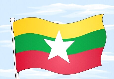 Myanmar Myanmar’s flag has three horizontal stripes of yellow, green, and red. A large white star sits in the center of the flag, overlapping all three stripes. This flag was introduced in 2010 after the ratification of a new constitution. The new flag used the same tricolor used in the 1940s. Symbolism: Yellow represents unity and happiness; green symbolizes fertility and peace; red represents bravery; white stands for purity, honesty, and compassion.