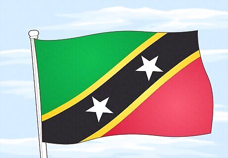 Saint Kitts and Nevis The flag of Saint Kitts and Nevis features a striking design with a green triangle in the upper left corner and a red triangle in the bottom right corner. Dividing the triangles is a thick black stripe bordered in yellow, with two white stripes inside the black stripe. This flag has been used since 1983. Symbolism: Green stands for the fertile vegetation of the islands; red represents the fight against slavery and colonialism; the black stripe stands for the country’s African heritage; yellow stands for the sun; the white stars represent the two islands, hope, and liberty.