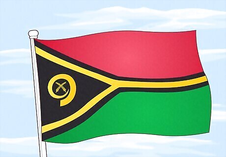 Vanuatu The flag or Vanuatu has horizontal red and green stripes and a horizontal yellow Y-shape (or pall). The pall is bordered in black. The triangle that fills the pall is black with a yellow symbol made up of two crossed leaves circled by the tusk of a pig. This flag has been used since 1980. Symbolism: Green represents the area’s lush vegetation; yellow represents peace and the light of Christianity; black symbolizes the rich soil of the islands as well as its inhabitants; the color red and the pig’s tusk represent the religious sacrifice of pigs that’s common on Vanuatu; the Y-shaped pall reflects the islands that make up Vanuatu.