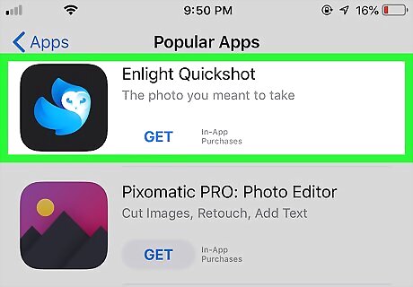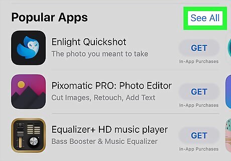 Tap an app to learn more about it. Each app has its own info page with screenshots, ratings, reviews, technical details, and pricing information. If an app costs money, the price will appear on the blue button near the top of the app's page. If it's free, the button displays the word "GET." If you've previously downloaded the app, the button will display a cloud with a downward-pointing arrow.