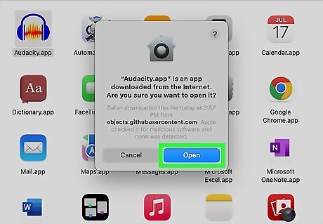 Open an app from an unsigned developer. If you see a pop-up that says "(the app) can't be opened because it is from an unidentified developer," follow these steps to open it: Open Finder and navigate to the app you've installed. You should find it in the Applications folder. You will not be able to perform these steps using the Launchpad, so make sure you're using Finder. Hold down Ctrl as you click the app's icon. A menu will expand. Click Open on the menu. Click Open to save the app as an exception to your security settings. Once you do this, you'll be able to open the app from the Launchpad or anywhere else as normal.