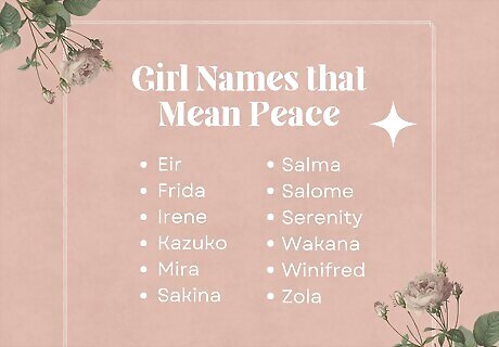 If you’re looking for a feminine name for a baby girl, there are also lots of names that mean “peace” or “peaceful.” Check out some of them below, like: Eir: “Peace,” “protection,” or “mercy,” Norse origin. Frida: “Peaceful,” German origin. Irene: “Peace,” Greek origin. Kazuko: “Child of peace,” Japanese origin. Mira: “Peace,” Slavic origin. Sakina: “Peace” or “tranquility,” Arabic origin. Salma: “Peace” or “safe,” Arabic origin. Salome: “Peace,” Hebrew origin. Serena: “Peaceful,” “quiet,” or “calm,” Latin origin. Serenity: “Peaceful” or “calm,” Latin/French origin. Shanti: “Peace” or “tranquility,” Sanskrit origin. Wakana: “Playing peaceful music,” Japanese origin. Winifred: “Friend of peace,” Welsh origin. Zola: “Peace” or “calm,” Xhosa/Zulu/South African origin.