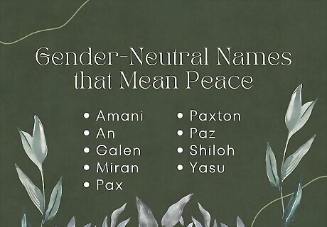 If you don’t want a traditionally masculine or feminine name, there are also gender neutral names that mean “peace” or “peaceful.” For instance: Amani: “Peace,” Swahili origin. An: “Peaceful,” “quiet,” or “safe,” Vietnamese origin. Galen: “Peaceful,” “calm,” or “tranquil,” Greek origin. Miran: “Peace” or “calm,” Slavic origin. Pax: “Peace,” Latin origin. Paxton: “Peaceful town,” Latin origin. Paz: “Peace,” Spanish origin. Shiloh: “Peace” or “tranquil,” Hebrew origin. Yasu: “Peaceful” or “calm,” Japanese origin.