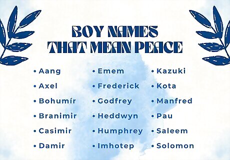 There are plenty of masculine names that mean “peace” or “peaceful,” making them perfect for your little boy. For example: Aang: “Peaceful soaring,” Chinese origin. Amandeep: “Peaceful light,” Indian origin. Axel: “Father of peace,” Scandinavian origin. Bohumír: “Peace of God,” Czech origin. Branimir: “One who defends peace,” Slavic origin. Casimir: “Peacemaker,” Polish origin. Damir: “Peace giver,” Slavic origin. Emem: “Peace,” Ibibio/Nigerian origin. Frederick: “Peaceful ruler,” German origin. Godfrey: “God’s peace” or “good peace,” German/French origin. Heddwyn: “Fair peace,” Welsh origin. Humphrey: “Peaceful warrior,” German origin. Imhotep: “One who comes in peace,” Egyptian origin. Kazuki: “Peace” and “bright” or “hope” or “tree,” Japanese origin. Kota: “Great peace,” Japanese origin. Manfred: “Man of peace,” German origin. Pau: “Peace,” Catalan origin. Saleem: “Peaceful,” Arabic origin. Siegfried: “Victorious peace,” German origin. Solomon: “Peace,” Hebrew origin. Ufuoma: “Peace,” Urhobo/Nigerian origin. Wilfred: “Desiring peace,” German origin. Xolani: “Peace,” Zulu/South African origin.