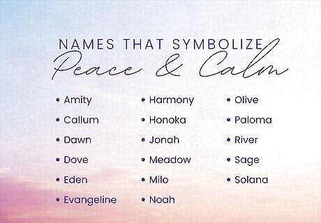 When picking a name with a distinct meaning, baby naming expert and content creator Sonya Prior suggests that you “don't just box yourself in by that singular word.” Instead, she says to think of “the whole feeling of that word” and what it can represent. There are plenty of masculine, feminine, and gender-neutral names that symbolize peace or have a calm, tranquil vibe, so check them out below: Amity: “Friendship” or “harmony,” Latin origin (feminine). Callum: “Dove,” representing peace. Latin origin (masculine). Dawn: “Daybreak,” English origin (feminine). Dove: Represents the bird of peace. British origin (feminine). Eden: “Place of pleasure,” referring to the Garden of Eden. Hebrew origin (gender-neutral). Edwin: “Blessed friend” or “prosperous friend,” English origin (masculine). Evangeline: “Bearer of good news,” Greek origin (feminine). Harmony: “Union” or “agreement,” Greek origin (feminine). Haven: “Safe place,” English origin (feminine). Honoka: “Harmony” and “flower,” Japanese origin (feminine). Jonah: “Dove,” representing peace. Hebrew origin (masculine). Meadow: “Field of grass and wildflowers,” English origin (feminine). Milo: “Merciful,” German origin (masculine). Noah: “Rest” or “comfort,” Hebrew origin (gender-neutral). Olive: “Olive tree,” symbolizing peace. Latin origin (feminine). Paloma: “Dove,” representing peace. Spanish origin (feminine). River: “Flowing body of water,” English origin (gender-neutral). Sage: “Wise” or “prophet,” Latin origin (gender-neutral). Solana: “Sunny place,” Spanish origin (feminine).