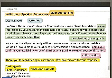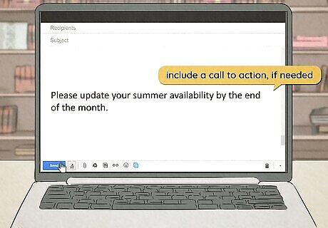 Include a call to action, if needed. A call to action is a statement that directs the reader to take action. Use a call to action when you need your recipient to do something in response to the email, like providing needed information or availability for a meeting. For example, “It’s important that you memorize the security clearance number provided with this email” or “Please update your summer availability by the end of the month.”