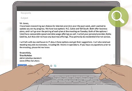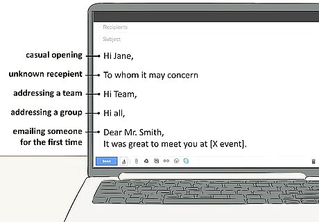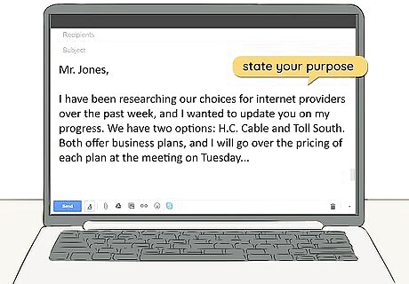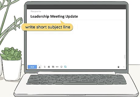 Create a concise, informative subject line. The subject line is the first thing your recipient sees upon receiving the email, so clearly state the topic and goal of your email. Be as specific as possible without becoming overly wordy. Try to keep your subject line under 60 characters and address the email’s goal in one sentence. Try things like: "Sales Report Update" "Issue Regarding Lunch Breaks" "Meeting Overview for March 12th"