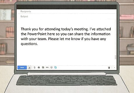 Include a closing remark. After stating the reason for the email and outlining any necessary action, it’s important to thank your reader and encourage them to follow up with any questions or concerns. For example, “Thank you for attending today’s meeting. I’ve attached the PowerPoint here so you can share the information with your team. Please let me know if you have any questions.”
