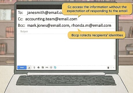 When should you use the CC or BCC fields? Use the CC or BCC field for recipients who don’t need to reply. The CC (or Carbon Copy) field allows recipients to access the information without the expectation of responding to the email. The BCC (Blind Carbon Copy) field does the same but protects recipients’ identities as others cannot see who else received the email. Some examples of when to BCC include: Writing a mailing list that includes people who don’t know each other Sending a newsletter to a subscribers list Delivering a farewell message to your colleagues