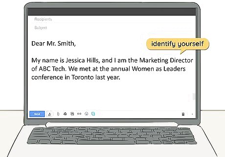 Briefly introduce yourself and thank the recipient, if necessary. If you’ve never met the person you’re writing to, state your name and position so they know exactly who they’re communicating with. Then, thank and acknowledge them for taking the time to read your email. This helps keep your email from seeming cold or impersonal. Pique your recipient’s interest by highlighting a common connection or shared experience (“We met at the annual Women as Leaders conference in Toronto last year”). It's all right to skip the introduction if you're already acquainted with the person you're writing. If you’ve contacted the recipient before but you’re not sure they remember you, leave your credentials in your email signature. If you are emailing someone for the first time, keep introductions brief and let them know who you are in one sentence. For example: "It was great to meet you at [X event]."