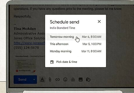 Schedule or send your email. Double-check that the recipient’s name and email address are correct before sending the email. Then, if the information is urgent and it’s within regular working hours, go ahead and send it. Otherwise, schedule it for a later date or time to ensure you send it at an appropriate hour. Some studies show the best times to schedule an email are at the top of the hour in the morning (10 A.M. being the best, followed by 9 A.M.) or right after lunch (at 1 P.M.) Consider adding the recipient’s email address after you’ve proofread to avoid accidentally sending the email before it’s completed.