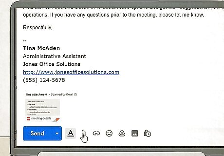 Add all relevant files and attachments. Oftentimes, professional emails include attachments with additional important information, like PDFs, presentations, or spreadsheets. Ensure any and all documents have been attached so you don’t have to send a follow-up email afterward.