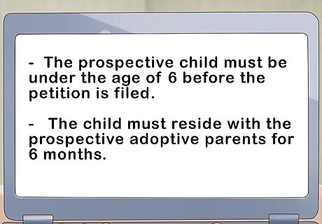 Learn Japan's guidelines. In addition to meeting the guidelines for adopting a child in the United States, prospective parents wishing to complete a special adoption must also meet Japan's guidelines for adoption. The child must also meet certain guidelines to be adopted internationally. The prospective child must be under the age of 6 before the petition is filed or below the age of 8 if the child has been under the care of the prospective parents since before the child reached age 6. The child must reside with the prospective adoptive parents for 6 months before the Family Court will issue an adoption decree.