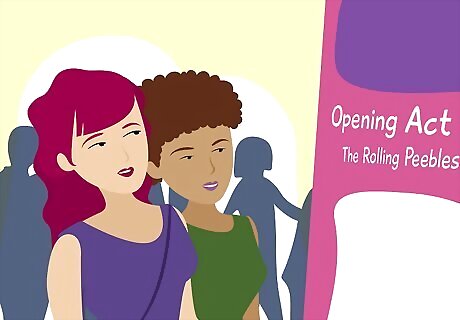 Determine if there is an opening act. Many people enjoy them, it gives you more bang for your money and it is a great way to see up and coming artists. Although sometimes these are smaller bands they are usually a style of music which compliments the headliner. If you are not interested, now would be a good time to locate your friends.