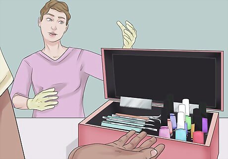 Ask preliminary questions. Before you pick the nail salon that you want to use, you can ask some questions of the staff and owner. This will help you make sure the salon follows safe practices and cleanliness standards as a general rule. When you choose a salon, call the salon and ask: Does your salon follow the safety standards? Do you use liquid disinfection or steam sterilization for your equipment? How do you cut calluses? Are the nail technicians required to wear gloves? Are there any nail technicians with advanced training?