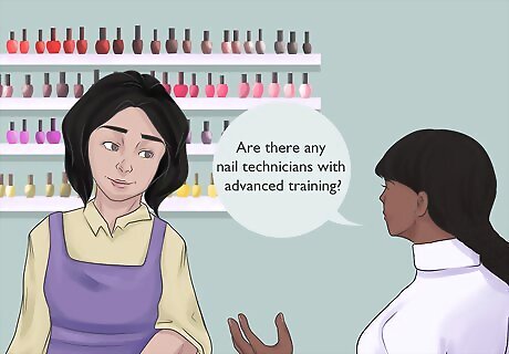 Check for licensing. In most states, nail technicians need to be certified and trained. You can ask the salon where their technicians were trained and certified to ensure that they will be able to adequately provide you clean service. You can search the online listings of individual state requirements to make sure you know what is required of the nail workers in your state.