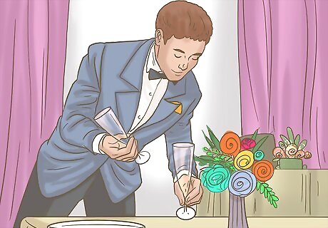 Place a menu and silverware for each guest at their place setting. You never want to throw all of the menus down on a table, as this seems rude and dismissive. Instead, carefully lay a menu and silverware at each place setting, and make sure your guests are seated before you leave the table. Be prepared to get water or other small items for guests. If they request more than that, politely let them know that their server will be right with them.