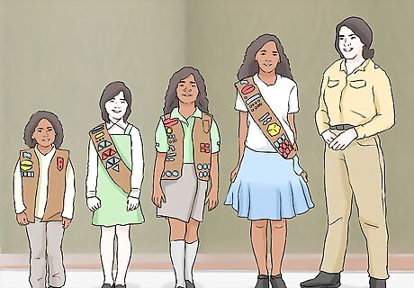 Figure out your age group. Though you can join Girl Scouts at any age, even as an adult, most Girl Scouts are between 5 and 18 years old. Depending on your age, you will be assigned a specific level. Currently, there are 5 main levels in Girl Scouts - Daisy, Brownie, Junior, Cadette, and Senior. However, recently there was a 6th level added called Ambassadors. Moving up in level is usually based on grade. For example, girls in Kindergarten and 1st grade are Daisies, while girls in 2nd and 3rd grade might be Brownies. Each level does the same sorts of activities with progression of steps for that age-appropriate level. Daisy and Brownies may participate in cabin camping; while older ages may participate in tent camping.