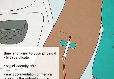 Get a physical exam. The physical is held after completing the ASVAB. Bring personal identification, including a birth certificate, Social Security card, and any documentation of medical problems throughout your life. You should also get a list from your recruiter of personal items to bring. The Marines will test your health to make sure you are fit to enlist. Upon passing the test, selecting your job specialty, and swearing in, you may be asked to leave immediately for boot camp.