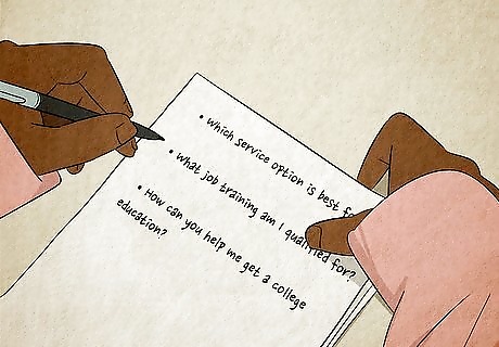 Write down questions you want answered. Your recruiter is there to help you become a successful Marine. They’ll interview you, but you should use the opportunity to clear up any uncertainties. Some questions you can ask them include: Which service option is best for me? What job training am I qualified for? How can you help me get a college education? Service shouldn’t be taken lightly. Make sure you fully understand all your options before enlisting and picking a career path.
