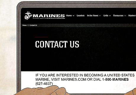 Find a recruiter in your area. Go online to the Marine Corps’s official website. At the top of the page, you’ll see the words “Contact a Marine.” Click this and fill out your information to get in touch with a local recruiter. You may also look for recruiting offices in your area. Search online or in a phone book for contact information.