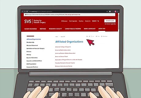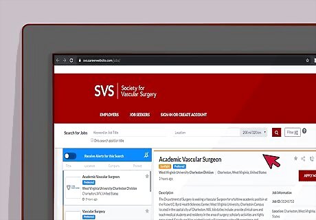 Join a professional group for vascular surgery to learn about open positions. Professional groups or societies are great ways to network with like-minded individuals and learn about new openings. Search online for a group, such as the Society for Vascular Surgery (SVS) or the World Federation of Vascular Societies, and see what they have to offer. While some groups require you to pay a membership fee, others only need you to register an account on their site. You can find a list of groups that you can join here: https://vascular.org/about-svs/affiliated-organizations. You may also find specific professional groups for your state or region.