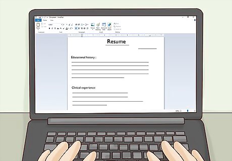Write a CV that lists your education and work experience. Make sure your name and any title you hold are listed at the top of the page in the largest font. List all of your educational history and the years that you attended, including any relevant electives or courses. Then, write down all of your clinical experience and the duties that you performed there to show prospective employers what you’ve been responsible for in the past. Use a font that’s easy to read, such as Arial or Times, and use bullet points to help employers find your information easier. Keep your CV limited to about 2–3 pages so it isn’t too overwhelming to look at. You may also include any research or publications that you’ve done in your CV.