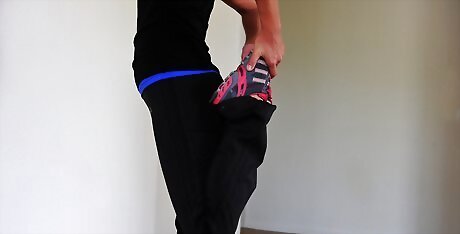 Tone your legs. Pull your legs up to your butt, with your hands and keep for 15 seconds. If you can't balance well hold on to a couch or chair.
