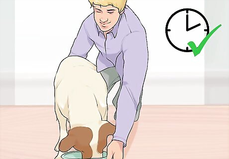 Feed your dog on a routine. Instead of leaving food out all day, you may want to adopt a food schedule for your dog. Routine can help lessen anxiety for dogs, and allowing them to rely on you for food can strengthen the bond. Try to choose two to three times per day when you can easily feed your dog each day. This helps your dog expect food from you at the same time each day.