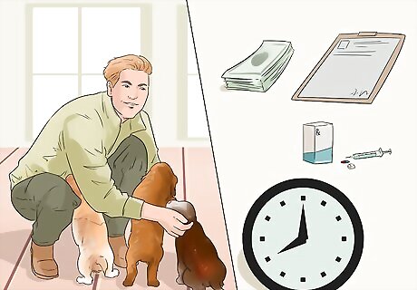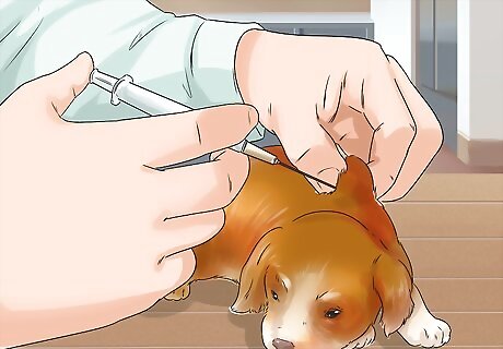 Vaccinate the puppies. Puppies should get their first shots between six and eight weeks of age. Three shots (Distemper, Measles, and Parainfluenza) are needed, but a fourth (Bordetella) is often recommended as well.