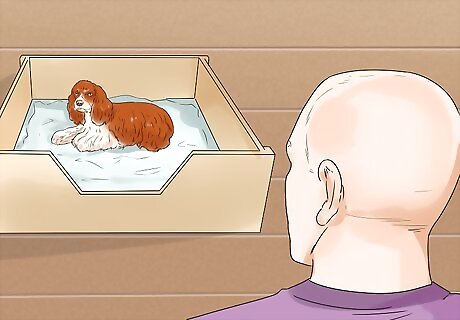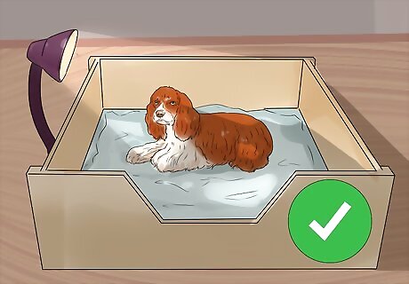 Designate a whelping box. When your dog is ready to give birth, she will want a dry, warm, and safe area. A whelping box is a special bed where your dog can give birth and raise her puppies. Whelping boxes can be purchased, or you can build your own. Find a quiet and warm area to place the box. Show your dog the box around 2 weeks before she gives birth. This is ideal so that she gets accustomed to the area, sounds, and overall environment. Dogs without a whelping box may choose an area of the house to give in birth in, such as a closet. You may want to set up a heat lamp in one corner of the whelping box. This will keep the puppies warm, especially after delivery.