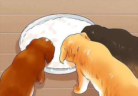 Wean the puppies. The puppies will be ready to wean from their mother’s milk at around three or four weeks of age. You can start offering them puppy food at this time. You might even mix a little bit of puppy food into a puppy milk replacer. This should make up about 10% of your puppies’ diet at first. Slowly increase their intake of food over the next few weeks. Your puppies should be eating solid food only by six weeks.