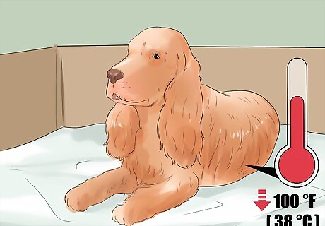 Watch the mother for signs of labor. Dogs typically give birth after 60 days. You will know when your dog is ready as she will begin to make a nest in her whelping box with blankets and toys. Take the dog’s temperature every few hours. The temperature will drop to below 100 °F (38 °C) roughly twenty-four hours before the delivery. When your dog’s cervix dilates, she is ready to give birth. Once you notice nesting behavior, you may want to line the whelping box with newspaper. Once the birth is over, you can toss out the newspaper and replace it with blankets.