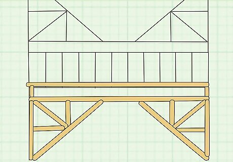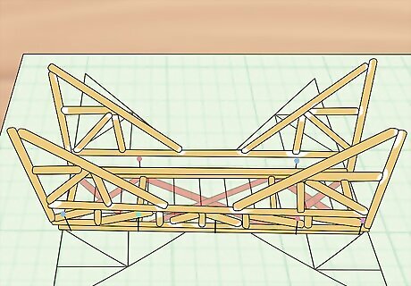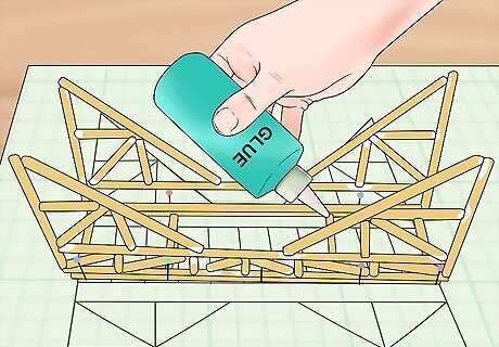 Add your lateral bracing. The lateral bracings of the bridge are the cross sections, often forming “X”s, on top of the trusses. While your bridge is still supported by pins around its sides, glue on your lateral braces. If you need to, you can use clothespins as tiny clamps. Again, let your bridge dry for as long as possible.