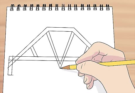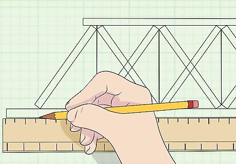 Create a rough draft drawing of your bridge. You don’t have to use graph paper for this draft. Draw both the side and top views of your bridge. Feel free to make as many rough drafts as you need to. There are several types of bridge construction. Think about what you want yours to look like. Most balsa bridges are types of truss bridges or arch bridges, as the wood lends itself well to this type of construction. Plus, these are two of the simpler types of bridges to engineer. Truss bridges are type of beam bridge supported by crossing posts above the bridge, and arch bridges are supported by large arches below the roadway of the bridge. Trusses have triangular frames of varying frequencies. Different types of bridges carry loads differently. When thinking about your design, you can build your own based on a type of bridge, e.g. truss or arch, or simply find a template for the type of bridge you want to build online and print this instead of using your drawings.