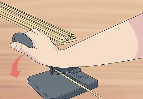 Cut your balsa wood strips. You can use the measurements on your drawings or just use the drawings as a template to mark each measurement with a pencil. Cutting your own strips from sheets will save you money. Use your woodcutter in conjunction with a straight edge. Make sure to account for all the pieces you’ll need: truss pieces, lateral bracing, and the roadway.