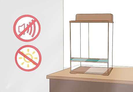 Place the cage in a quiet area of your home. Chameleons can be stressed very easily. Place your chameleon’s cage in a quite area that is relatively free of noise and distractions. Within the area, keep the cage out of the path of continual direct sunlight to prevent the cage from overheating. Position the cage so that it can receive a good amount of shade during the day.