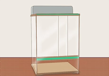 Select a cage type and size for your chameleon. Prepare your chameleon’s habitat before you bring him home. In fact, you could even start on this after you have decided to buy a chameleon. Chameleons grow quickly, so you will need to buy a fairly large cage. The minimum recommended cage size for a pet chameleon is three feet (91 centimeters) x three feet (91 centimeters) x four feet (122 centimeters). A screened or wire cage, a glass terrarium with a screened top, and a large and tall bird cage are suitable enclosures for a chameleon. This is only advisable if you live in a climate with an ambient temperature above 86F/30C. Otherwise, the chameleon will be too cold. Chameleons like to climb and perch on branches, so a tall cage is ideal for a chameleon. A vivarium is the ideal housing solution. It has 3 sides made of wood or insulative material, and a glass front. It is thermally efficient and has good ventilation. Your local pet store will have a variety of cages from which you can choose.