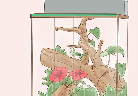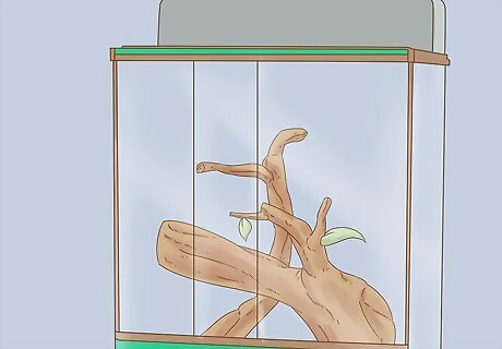 Place branches in your chameleon’s cage. Given your chameleon’s arboreal nature, he will want to have plenty of branches to climb and perch on. The branches should be a range of diameters. The variety of branch diameters will encourage your chameleon to use his feet in different ways. Having horizontal and vertical branches will also give your chameleon a variety of branches to climb on. Different orientations and diameters of branches can be form of environmental enrichment for him. Your local pet store will have branches, along with containers to secure the branches in the cage.