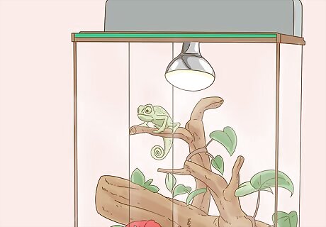 Place various light bulbs above your chameleon’s cage. The lights will provide a source of light and heat for your chameleon. One type of lightbulb you will need is a basking bulb, which will heat a focal point of your chameleon’s cage. The recommended temperature at that spot is 90 to 105 degrees Fahrenheit. An incandescent light bulb can be used for the basking light, but you may need to try different wattages to determine which wattage will produce the desired temperature. A fluorescent light should be placed next to the basking bulb. This light will provide UVB/A light, which your chameleon will use to produce the active form of vitamin D3. A light fixture will keep the lights situated above the cage. Do not use heated rocks as a heating source, since they could burn your chameleon. Night lights are not recommended, since they could make the cage too warm for your chameleon at night. Use a thermometer to keep your chameleon’s cage at 80 to 90 degrees Fahrenheit during the day and the mid-70s at night. Bulbs should be switched out about every 6 to 12 months.