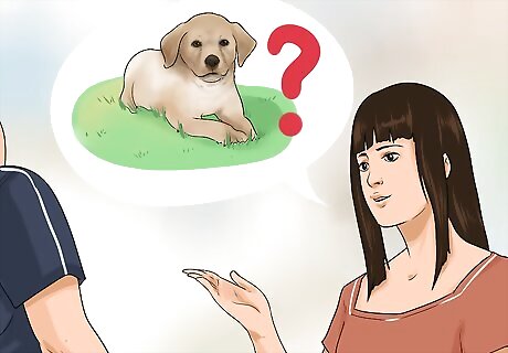 Find out how the puppies will be raised before they are adopted out. Where will the puppies be born and raised? Will they get regular handling and socialization from a young age? What sorts of experiences will they encounter? At what age will they be allowed to go to their new homes? Puppies should never go to a new home until they are at least 8 weeks of age. In some states, like California, that is the law. It's a good idea to see the puppy with its mother and litter mates. That way you know that the dog was not born in a puppy mill and that the breeder is actually breeding the dogs.
