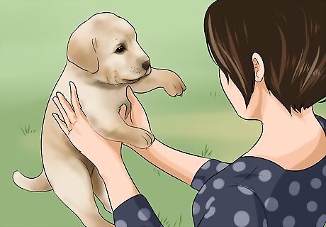 Read up on Labradors. Labradors can be very high energy dogs and are fairly large animals when full grown. There are books on the market that offer guidelines to help you make a choice of breed or temperament. For instance, The Perfect Puppy: How to Choose Your Dog by Its Behavior, by Doctors Benjamin and Lynette Hart may be helpful or The Right Dog for You by Daniel Tortora is another resource to help you with your decision. Another way to learn about Labs is to read about the breed's history and standard. Educate yourself about temperament testing a dog or puppy as a method to help you choose a dog that fits your family and lifestyle. There are many resources out there on the subject. A puppy that is really high energy may be the right fit for an active family able to exercise this kind of pet, but may be too much energy for another family. Puppies who are extremely shy may prove overly fearful later and require extra attention toward socialization to prevent serious behavior issues.