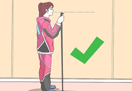 Size your skis according to your body size. No matter which type of cross-country ski you choose, skis work best when they are fitted to your height and weight. Ideally, when sizing your skis you'll want to consider a combination of things including ski type, terrain and experience level alongside body size. However, a few general rules can help you as you find the right size for you: While standing with one arm held straight up over your head, your upright ski should come up to your wrist. At standing position, the middle of your ski should be off the ground. When you push down on the ski with your foot, the middle should bend to touch the ground. Finding your perfect fit may require a visit to a local ski shop where an expert can provide customized advice.