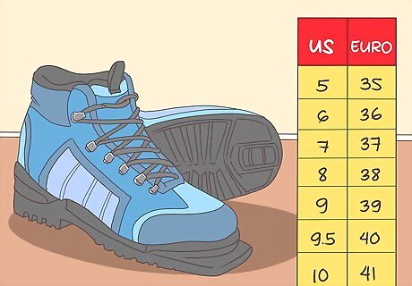 Buy boots that match your ski bindings. Finding comfortable boots that work with the skis you’ve selected is key. As such, it’s important to find a pair that fit you well and match your ski binding. You can buy skis that come with bindings already attached, or you can purchase the binding separately. If this is your first foray into purchasing cross country skis, going with a pre-installed binding is simplest. This is called a pre-mounted ski and it is a common beginner-type ski. Cross country ski boots are measured in European sizes. If you know your size in the US system, you can use a conversion chart to find out what your European size is. If you’re a beginner or you don’t know your shoe size at all, you’ll want to visit your local ski shop to get measured properly. Read the specifications for the binding on your ski to make sure you buy a boot that will match. Match up the types of bindings with your boots to make sure you have a fit. Common examples of what to look for include an NNN or SNS designation.